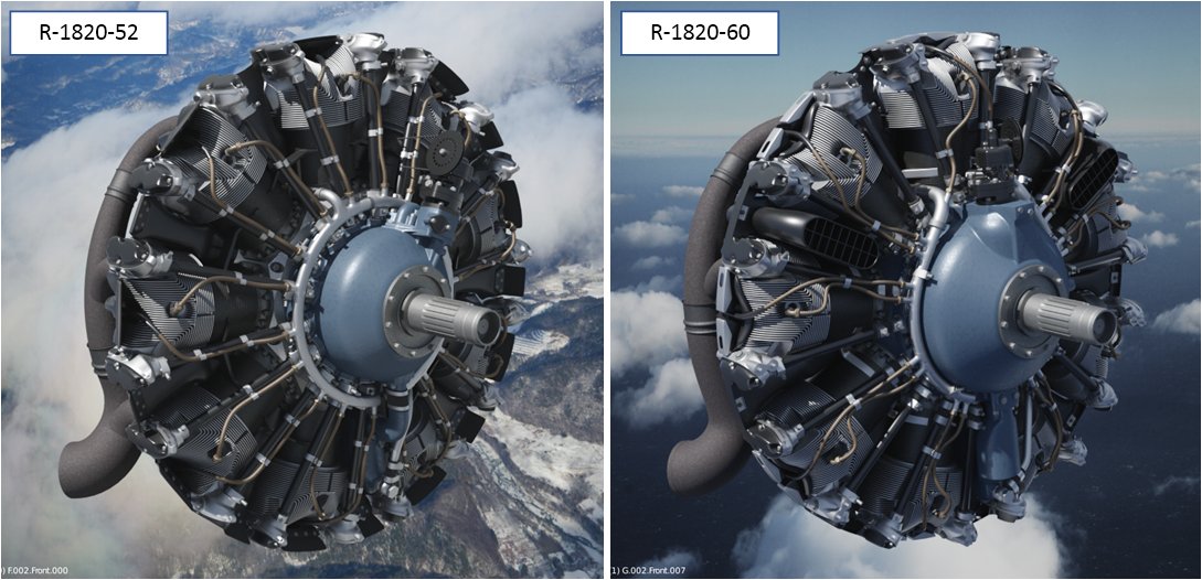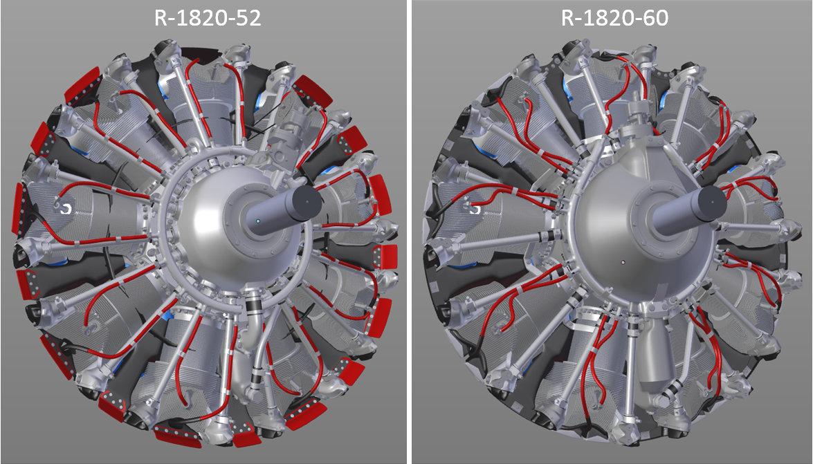 Since December 2017 I have worked on the R-1820 "Cyclone" engine for my SBD model. The SBD-1 and SBD-2 used the R-1820-32, SBD-3 and SBD-4 used the R-1820-52, while SBD-5 used the R-1820-60, and SBD-6 used the R-1820-66. The R-1820-32 most probably looks similar to the R-1820-52. However, the later versions of this engine were redesigned, and most parts of the R-1820-60 differ from the -52. It seems that there are no significant differences beteen the R-1820-60 and -66. Thus I decided to recreate two versions of this engine: the R-1820-52 for the SBD-1, -2, -3 and -4, and the R-1820-60 for the SBD-5 and -6. See this blog for the progress reports.